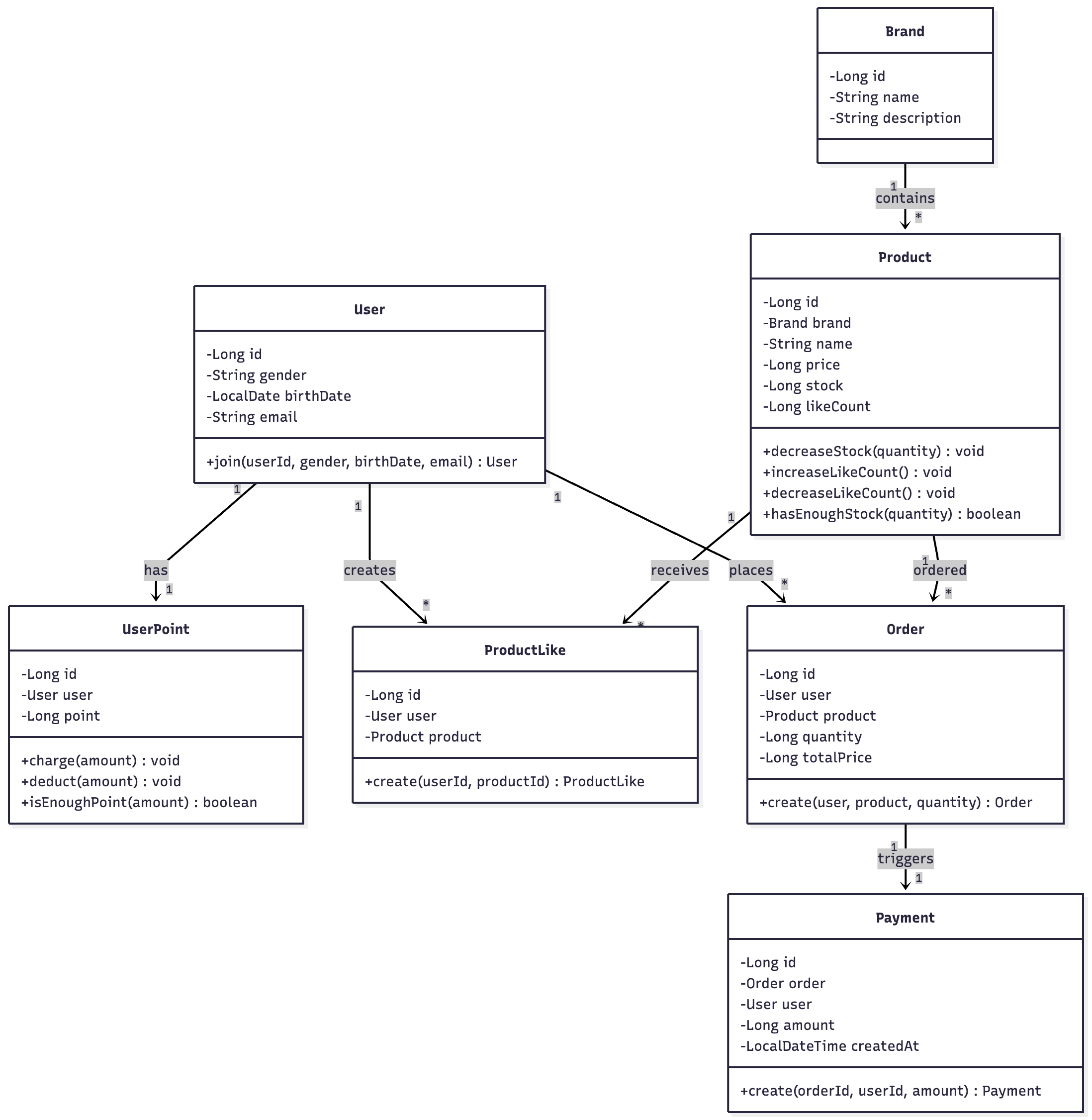 UserPoint가 "포인트 상태를 알고 차감할 책임"을 가졌다 →user_points.balance컬럼이 필요하다Product가 "재고 상태를 알고 감소시킬 책임"을 가졌다 →products.stock컬럼이 필요하다Order가 "주문 정보를 생성할 책임"을 가졌다 →orders테이블이 필요하다