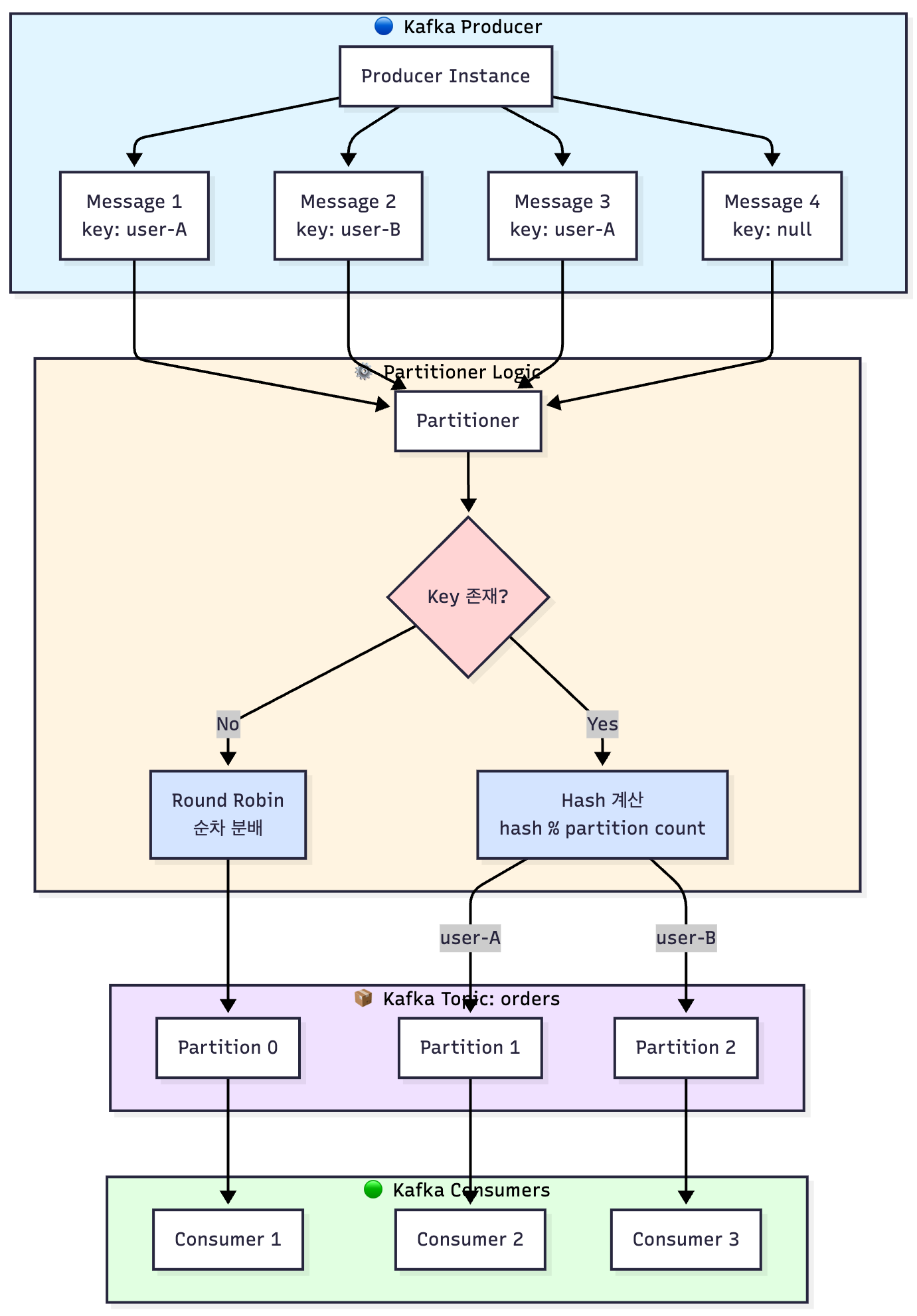 같은 키(user-A)를 가진 메시지는 항상 같은 파티션(Partition 1)으로 가는 것을 확인할 수 있습니다.